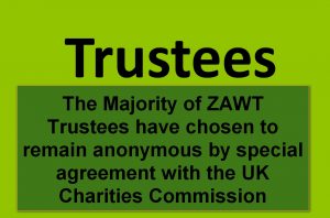 ZAWT has no administration or other overhead, we pay no salaries, we have no costs which are not born directly by volunteeers and Trustees. Some of our Trustees have opted to remain anonymous given the real threat of danger to family and friends in Zimbabwe, and to do so have special dispensation from the Charities Commission in the UK. Others feel no threat due to lighter links, and no family in Zimbabwe and thus are happy to be publicly named.